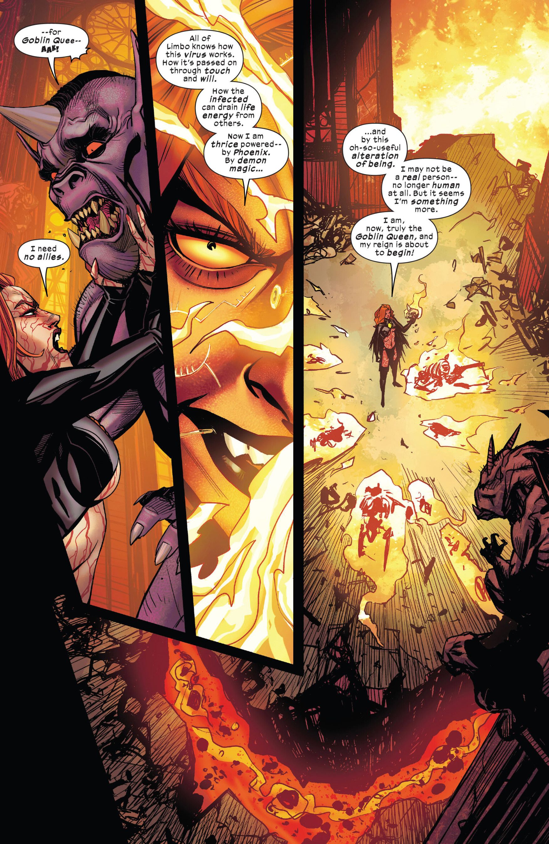 Jean gris El número 3 está escrito por Louise Simonson y dibujado por Bernard Chang. En su búsqueda a través de la historia, Jean Grey llegó durante el ataque de Madelyne Pryor, también conocida como la Reina Goblin a la ciudad de Nueva York, que fue narrado durante el Infierno evento cruzado. En esta nueva línea de tiempo, la Reina Goblin no solo tiene sus poderes demoníacos, sino que también absorbe la Fuerza Fénix.