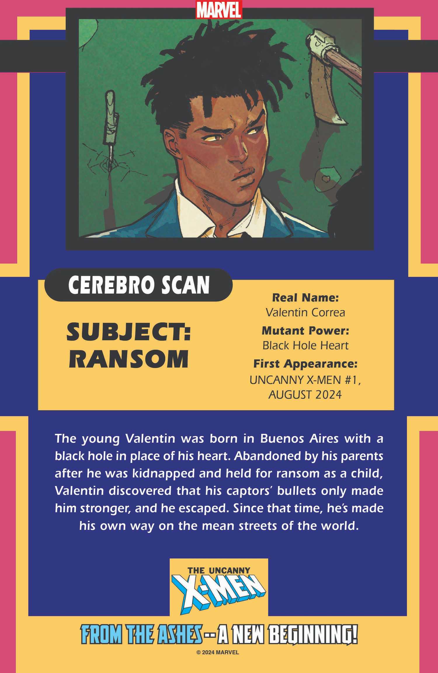 Valentin Correra, que se hace llamar Ransom, es el siguiente personaje cuyos orígenes se revelan en X-Men asombrosos Montaje de entrenamiento del n.° 3. Originario de Buenos Aires, siendo recién nacido sus enfermeras descubrieron que no tenía corazón. Sus padres ricos se sintieron avergonzados de esto y vieron esto como si su hijo fuera imperfecto. Finalmente, Valentin fue tomado como rehén y cuando sus padres se negaron a pagar el dinero del rescate, le dispararon catorce veces. En lugar de matarlo, las balas activan sus poderes mutantes y posteriormente huye.