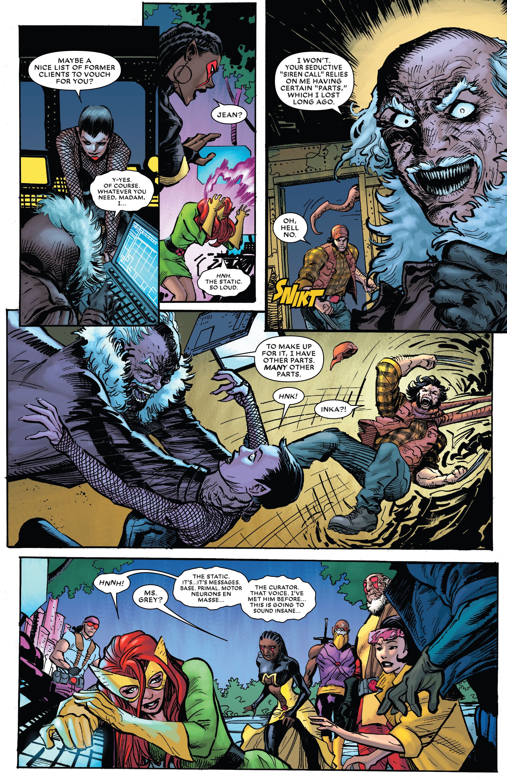 El número está escrito por Tim Seeley, dibujado por Sid Kotian, coloreado por Edgar Delgado y rotulado por Joe Caramagna. The Forgiven ha iniciado recientemente a un nuevo miembro, Redblood, que los traiciona rápidamente. Mientras persiguen a Redblood, los Forgiven descubren partes de cuerpos mutantes, lo que trae a los X-Men, incluido el ex vampiro Jubilee, a la refriega. Los dos equipos siguen la pista de un misterioso personaje llamado “el curador”. Al abordar su bote en el mar, Jean Grey inmediatamente siente que algo anda mal; se entera de que el curador es en realidad Roy Powell, un científico con el que luchó con la encarnación original de los X-Men. Powell encontró el monstruo de Frankenstein y lo usó contra el equipo, pero no se lo ha vuelto a ver desde entonces. En los años posteriores, Powell ha desarrollado una obsesión con la inmortalidad, tomando partes del cuerpo de todos los que pudo, ya sea humano, vampiro o mutante, para extender su vida. Powell también comanda una legión de monstruos grotescos que atacan a los dos equipos.