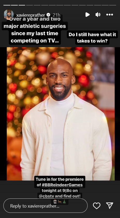 En una historia promocional de Instagram, Javier compartió que ha tenido “Dos cirugías atléticas importantes desde la última vez que competí en televisión”. junto con su foto del elenco de Juegos de renos de Gran Hermano. “¿Todavía tengo lo necesario para ganar?” Xavier postó, junto con la foto de él sonriendo frente a un árbol de Navidad.
