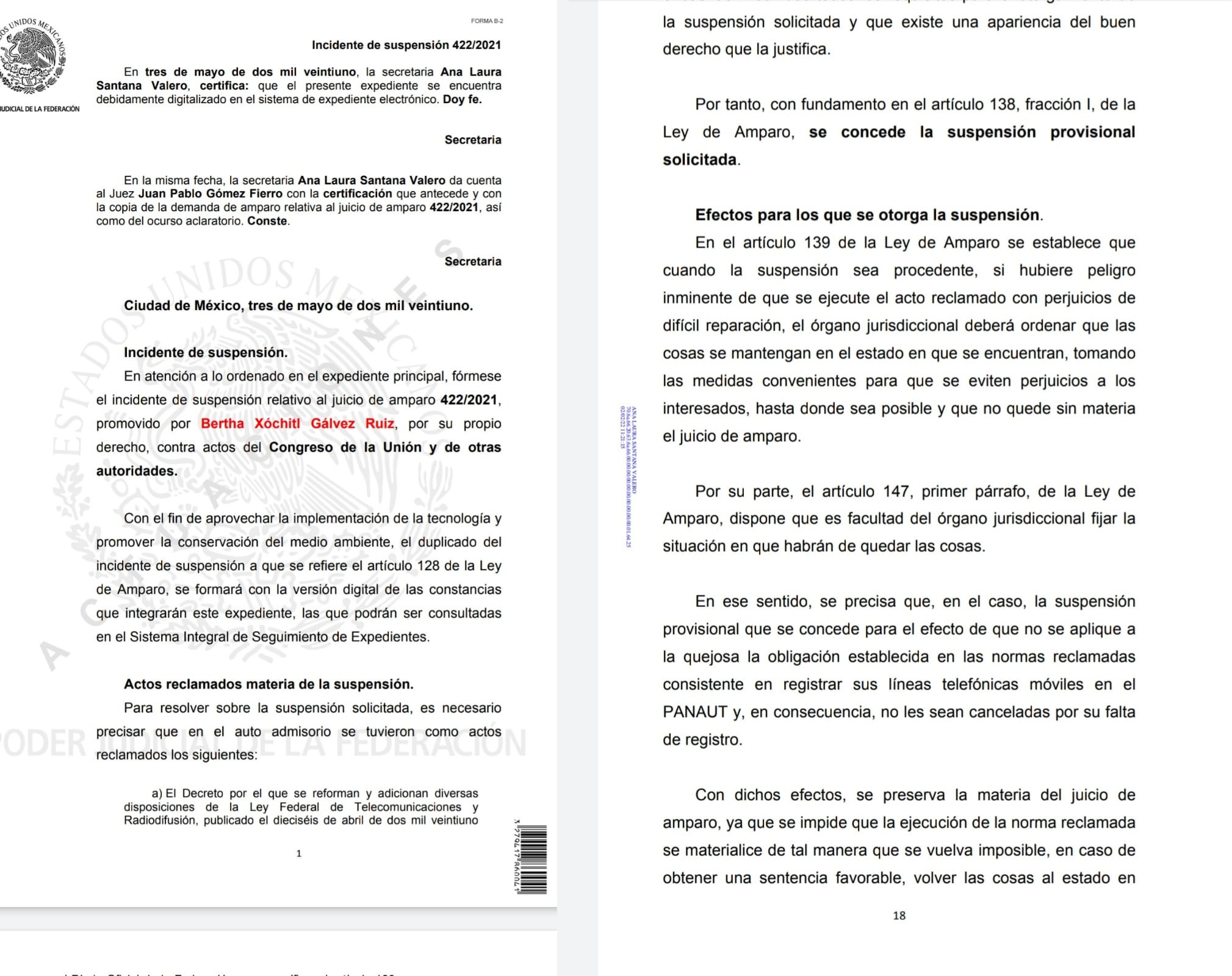“La suspensión provisional que se concede para el efecto de que no se aplique a la quejosa la obligación establecida en las normas reclamadas consistente en registrar sus líneas telefónicas móviles en el Panaut y, en consecuencia, no les sean canceladas por su falta de registro” argumenta el documento difundido por la senadora.