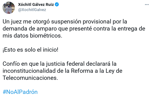 La senadora Xóchitl Gálvez obtuvo una suspensión provisional para no entregar sus datos biométricos al Padrón Nacional de Usuarios de Telefonía Móvil (Panaut), derivado de una demanda de amparo que interpuso.