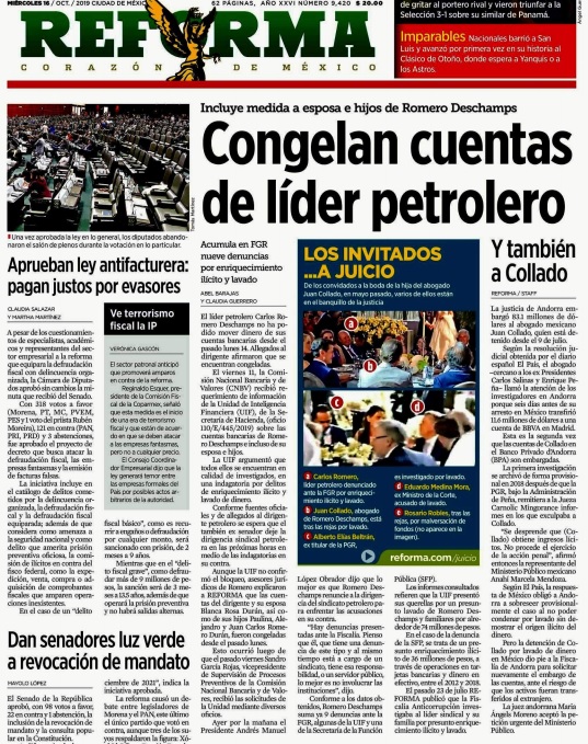 El diario publica esta noticia en su primera plana de este día y señala que “el viernes 11, la Comisión Nacional Bancaria y de Valores (CNBV) recibió requerimiento de información de la Unidad de Inteligencia Financiera (UIF), de la Secretaría de Hacienda (oficio 110/E/445/2019) sobre las cuentas bancarias de Romero Deschamps e incluso de su esposa e hijos. La UIF argumentó que todos ellos se encuentran en calidad de investigados, en una indagatoria por delitos de enriquecimiento ilícito y lavado de dinero”.