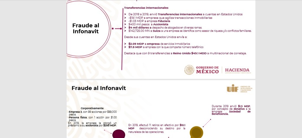 “Hubo una serie de transferencias para efecto de que el Infonavit pagara por la recesión de un contrato por cinco mil millones de pesos a una empresa de nombre Telra, a partir de lo cual se empezaron a hacer transferencias a empresas de Estados Unidos”, comentó.