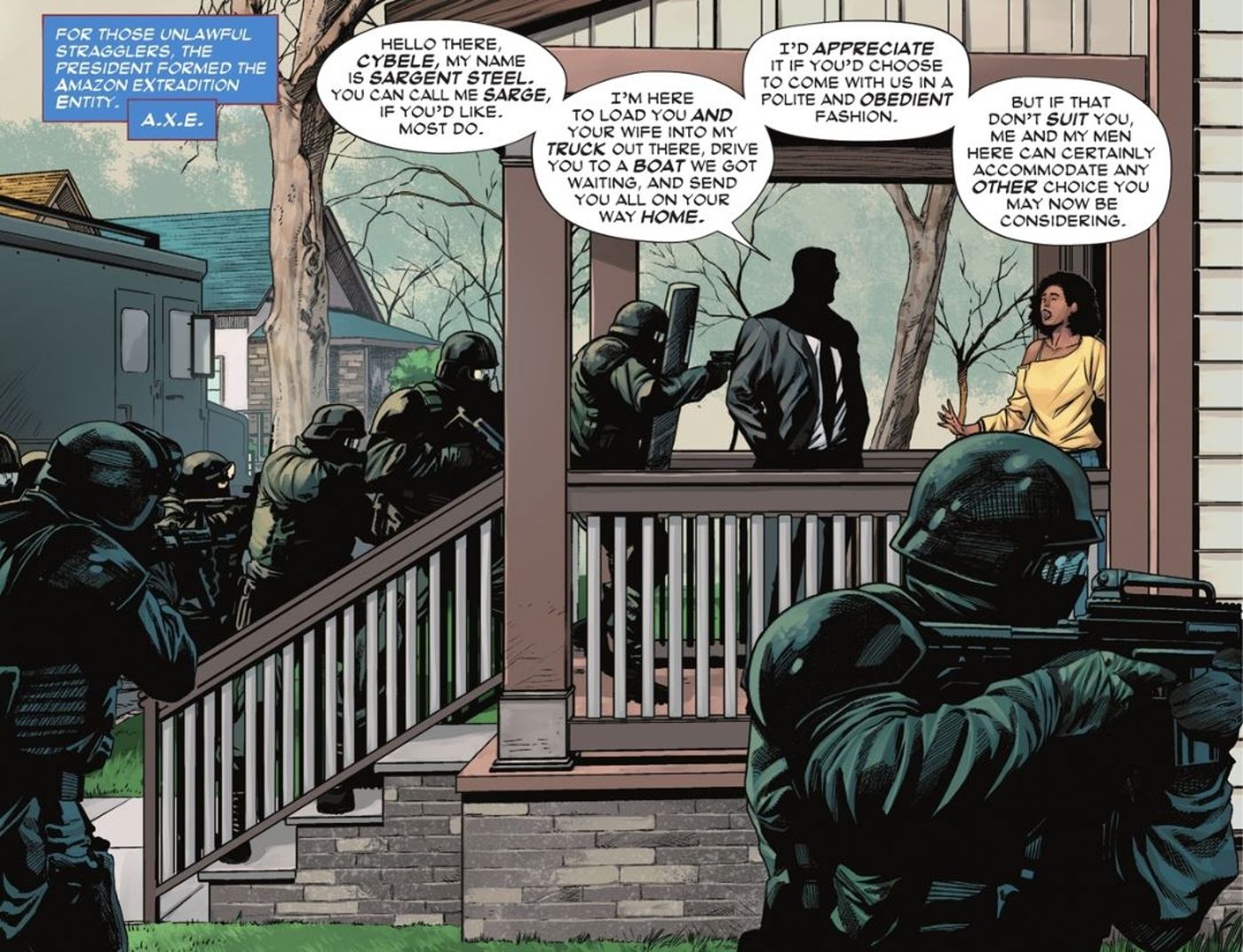 Wonder Woman, sin embargo, se negó a abandonar el país y se lo contó a AX y a su líder Sarge Steel. Diana era demasiado para el escuadrón y fácilmente los anuló e interrogó a Steel sobre quién estaba a cargo de AXE, descubriendo que la reciente histeria anti-Amazon fue fomentada por el rey secreto de Estados Unidos, Sovereign.