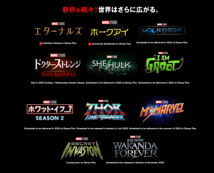 Residencia en Japón de Marvel sitio web, Marvel Studios ha Caballero de la Luna, Ella Hulk, yo soy groot, y Sra. maravilla En la tuberia. Si bien se ha confirmado que todos estos se implementarán en 2022, ¿Y si…? de MarvelEl lanzamiento de no se ha anunciado teniendo en cuenta que solo se ha confirmado oficialmente durante el Día de Disney de 2021. Mientras tanto, aunque invasión secreta se esperaba que se estrenara este año, el gráfico del sitio web no dice que esté programado para un debut en 2022; en cambio, solo dice: “Próximamente en Disney+”.