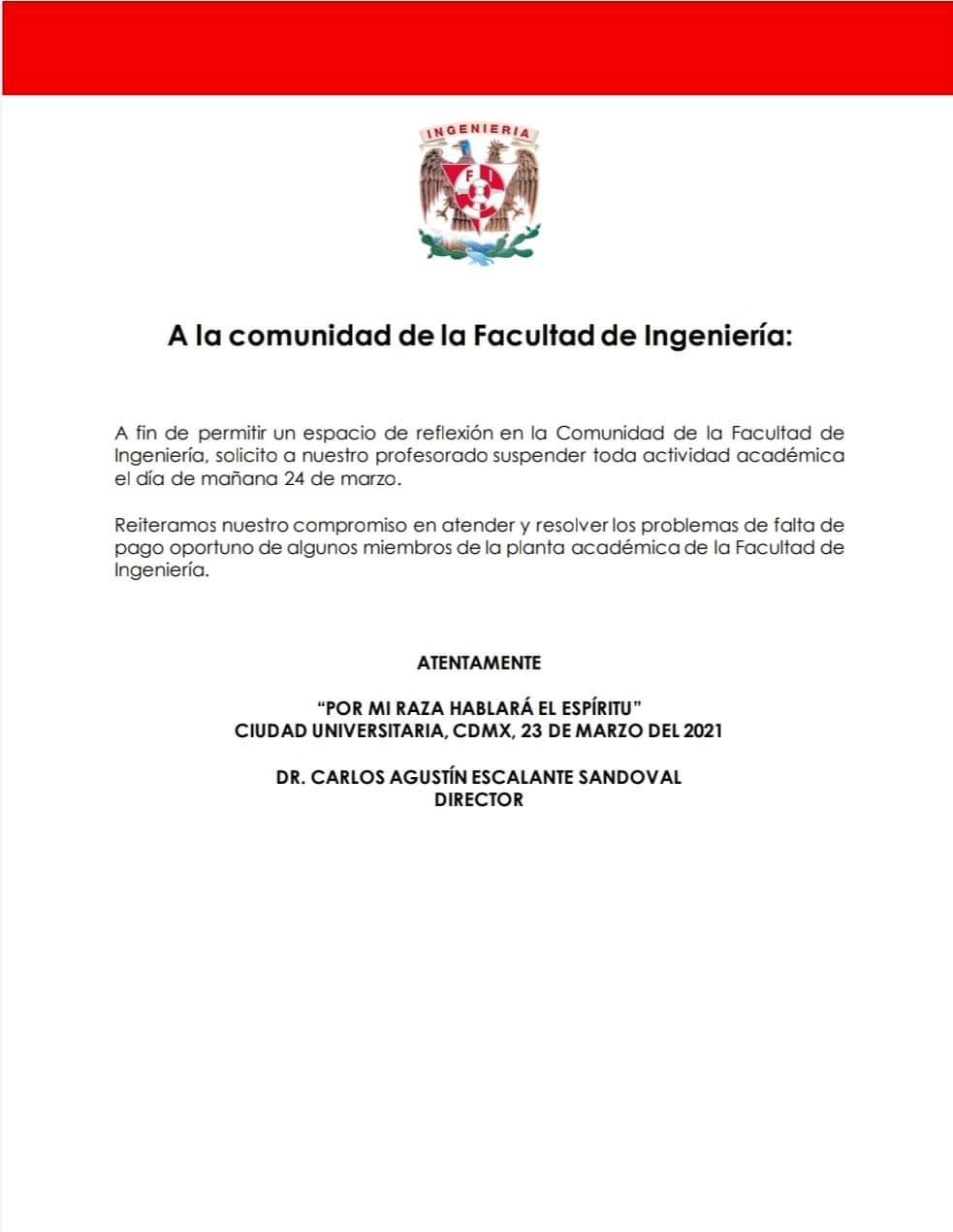 Por su parte, la Facultad de Ingeniería emitió el siguiente aviso: