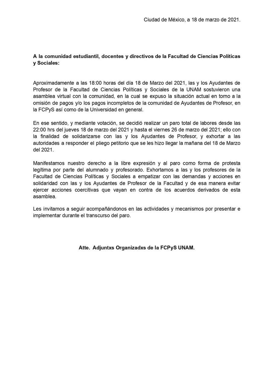 Ayudantes de profesores de la Facultad de ciencias Políticas y Sociales informaron en un comunicado que sostuvieron una asamblea virtual con la comunidad estudiantil el pasado 18 de marzo, en la que se decidió -por mayoría de votos- realizar un paro total de labores hasta el viernes 26 de marzo.
