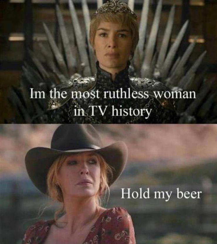 En esto piedra amarilla meme, John Dutton se sienta con confianza en el trono de hierro, Beth (quien ha sido comparada con la tempestuosa y despiadada Cersei en Game of Thrones) a su lado. ¿Esto lo convierte en Tywin Lannister? Ciertamente tiene el comportamiento tranquilo y sereno del patriarca Lannister, a menudo obligado a suavizar las disputas de sus hijos.