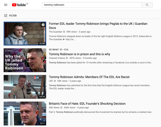 Las búsquedas de prueba de "Tommy Robinson" en YouTube ahora devuelven una serie de informes de noticias, en lugar del propio canal de Yaxley-Lennon, como fue el caso el mes pasado.