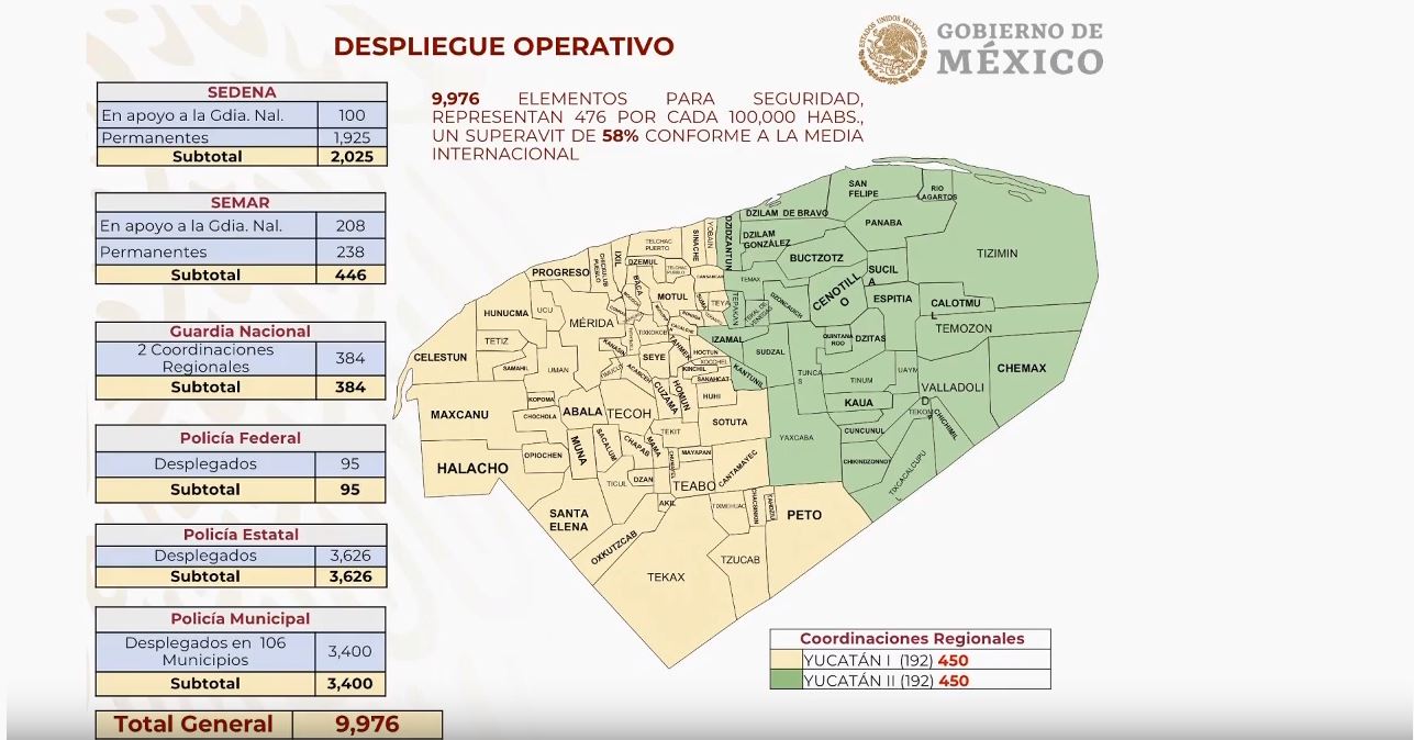 “Es algo muy satisfactorio el poder informar que este es un estado seguro. Es un ejemplo a seguir, todo esto lo han logrado fundamentalmente las autoridades de Yucatán. El caso de Yucatán es para recoger lecciones, enseñanzas de cómo se debe de actuar para garantizar la paza los ciudadanos”, señaló durante la conferencia