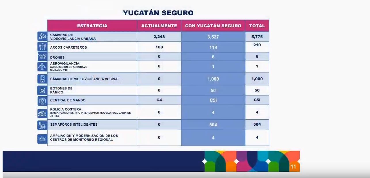 Asimismo, indicó que para iniciar el Programa Yucatán Seguro invirtieron 2,600 millones de pesos para adquirir más cámaras de seguridad, arcos lectores, drones, aeronave de videovigilancia, botones de pánico y semáforos inteligentes.