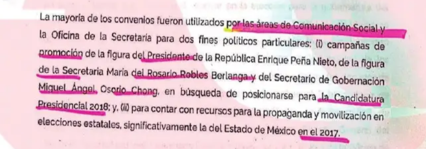 En algunos casos, estos convenios fueron utilizados para llevar a cabo actividades de carácter extrainstitucional como “brigadas de propaganda política, campañas de comunicación social extraordinarias, apoyo a sectores sociales. También pago de compromisos de campaña del presidente Enrique Peña Nieto y otras actividades irregulares, relacionadas con la política del Gobierno Federal y de las metas electorales”.