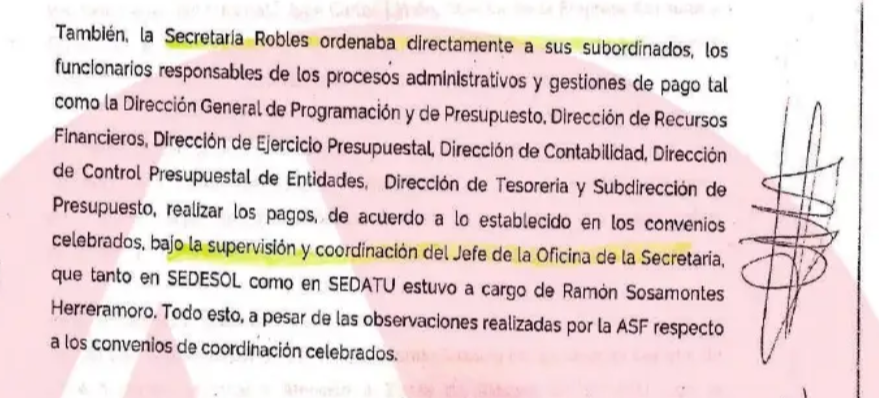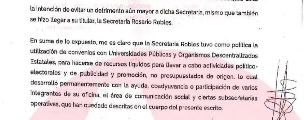 “En particular, destaco que me consta que María del Rosario Robles Berlanga, recibió y conoció las observaciones de irregularidades que realizó la Auditoría Superior de la Federación, con respecto a la modalidad de contratación denominada “Convenios de Colaboración con entidades públicas”, señala el documento.