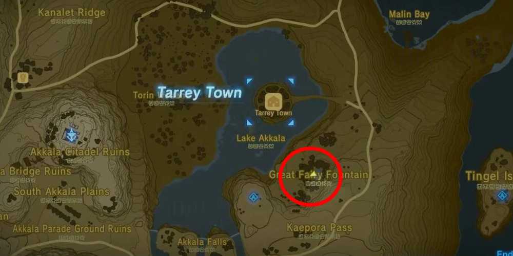 Otro de Breath of the Wild’s Grandes fuentes de hadas se puede encontrar en la región de Akkala del mapa, justo al sur del lago Akkala. Aquí es donde los jugadores pueden construir Tarrey Town como parte de la búsqueda secundaria más larga del juego. La fuente está cerca de la carretera, escondida en una pequeña sección de bosque en un acantilado sobre el lago.