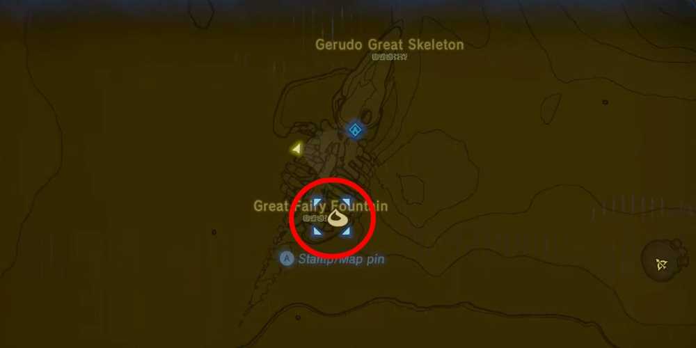 En Breath of the Wild’s Gerudo Desert, La última fuente de la gran hada se puede encontrar escondida debajo de un esqueleto de Leviatán masivo en la esquina suroeste del mapa. Esta ubicación, conocida como Dragon’s Exile, también es el hogar del Santuario Hawa Koth, lo que hace que esta fuente sea una de las más fáciles de teletransportar.