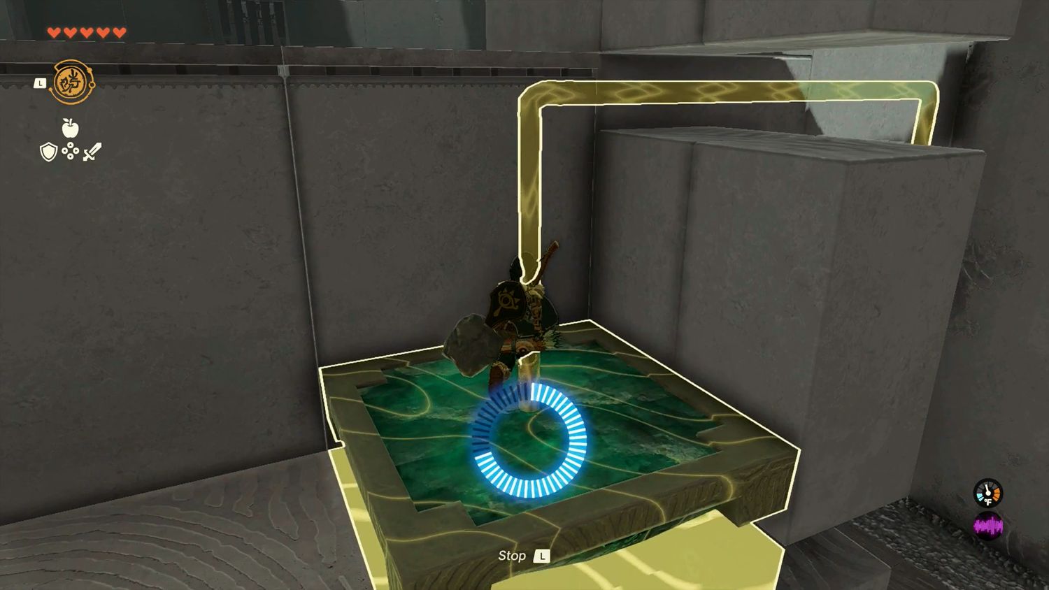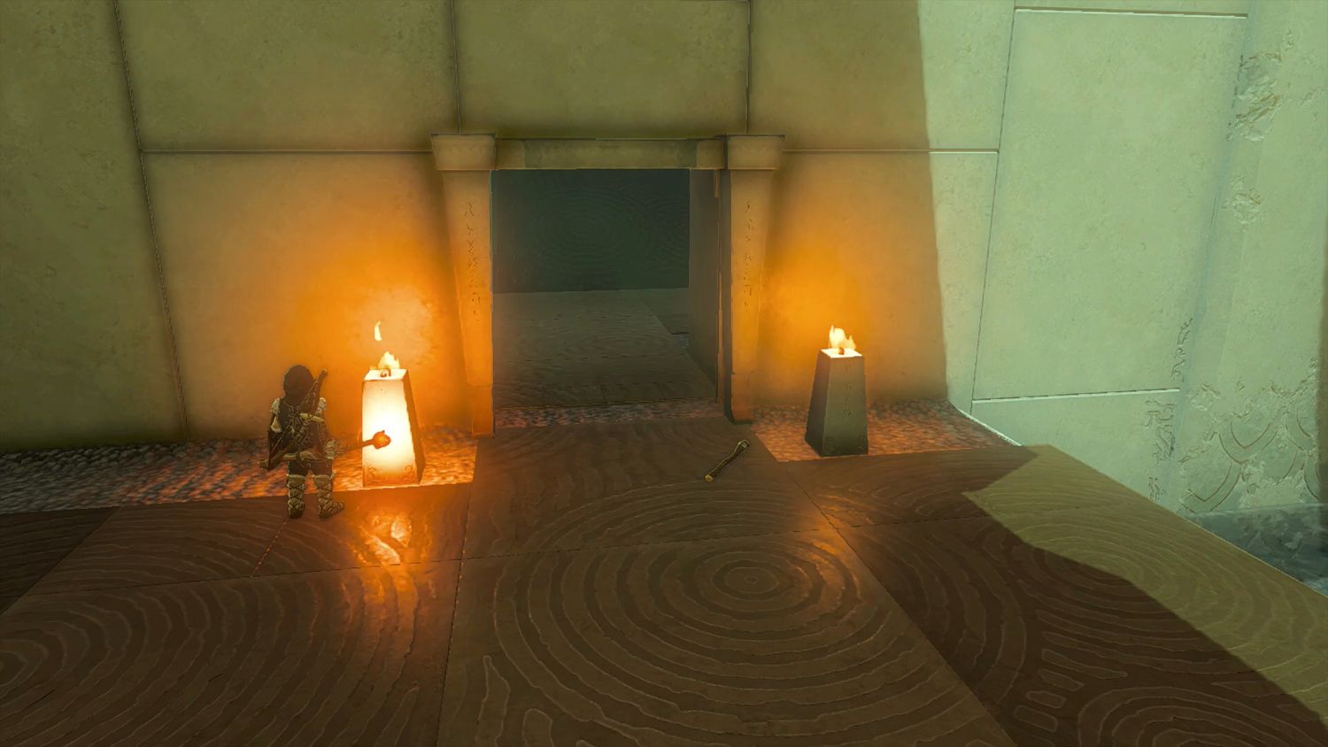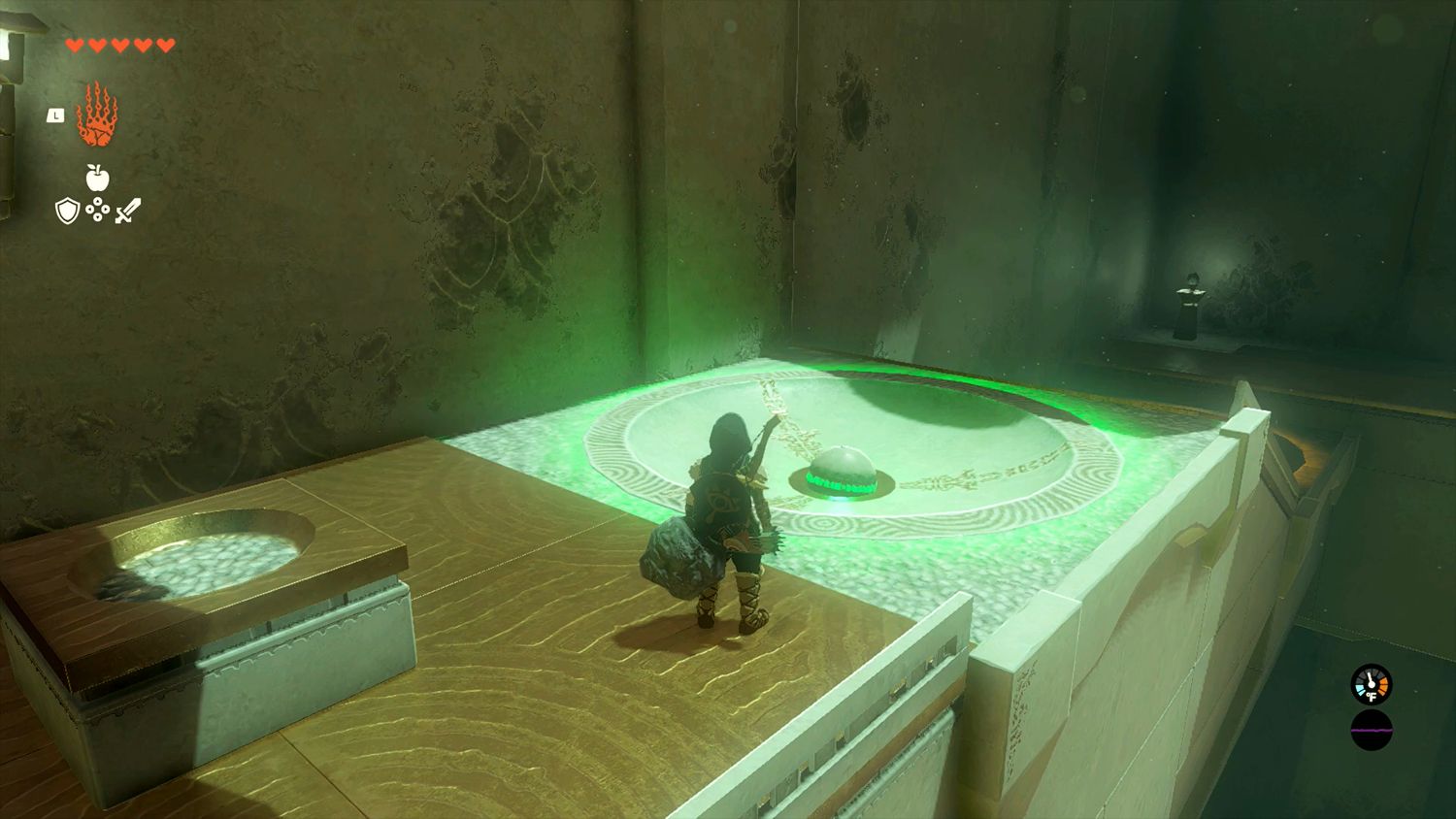 En el interior, los jugadores se encontrarán en una cámara más grande. Las puertas de adelante están cerradas, por lo que los jugadores deben dirigirse al lado derecho de la habitación, donde encontrarán dos hoyos en el piso y una pelota que pueden mover con Ultrahand.