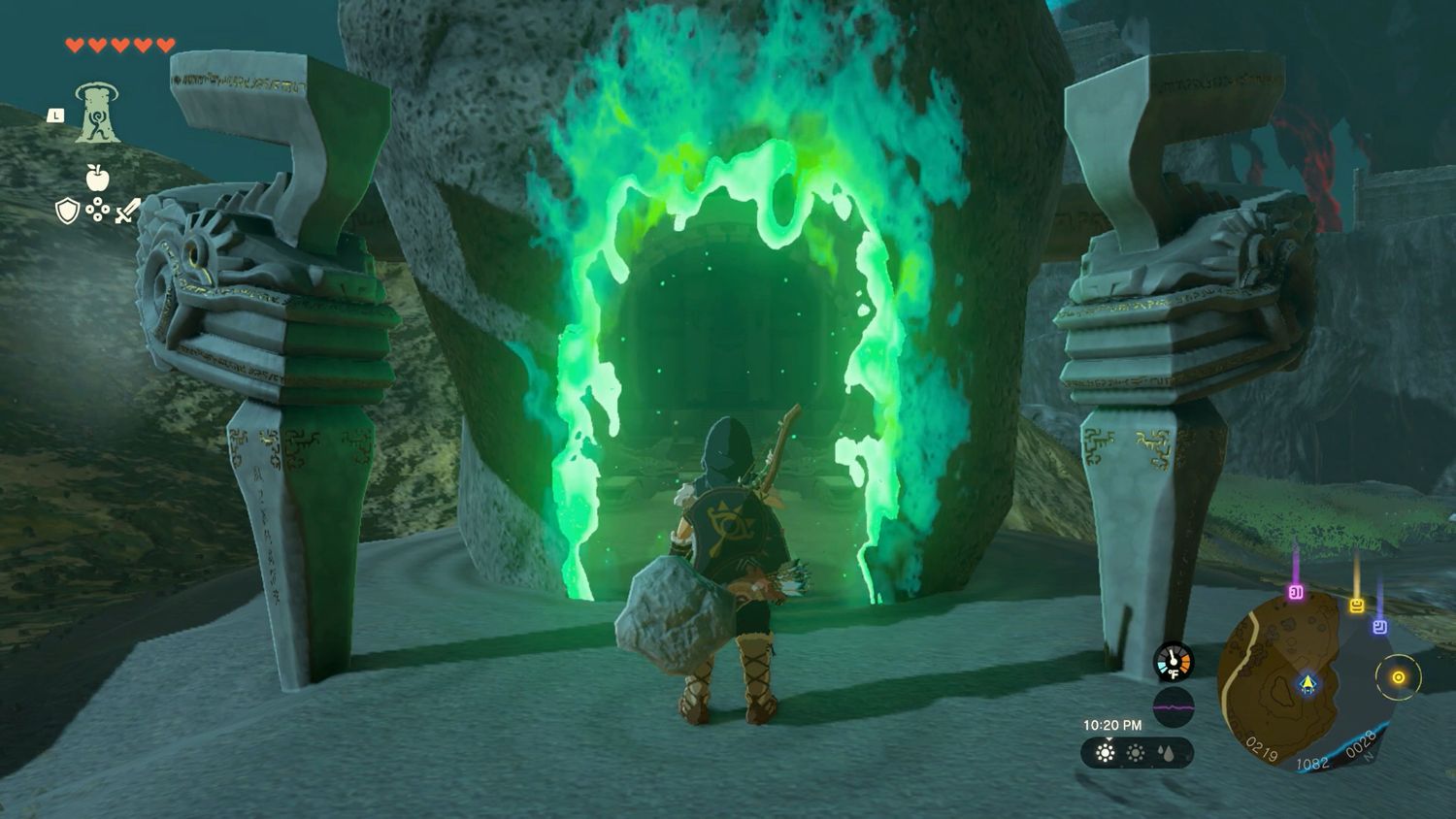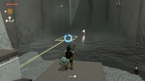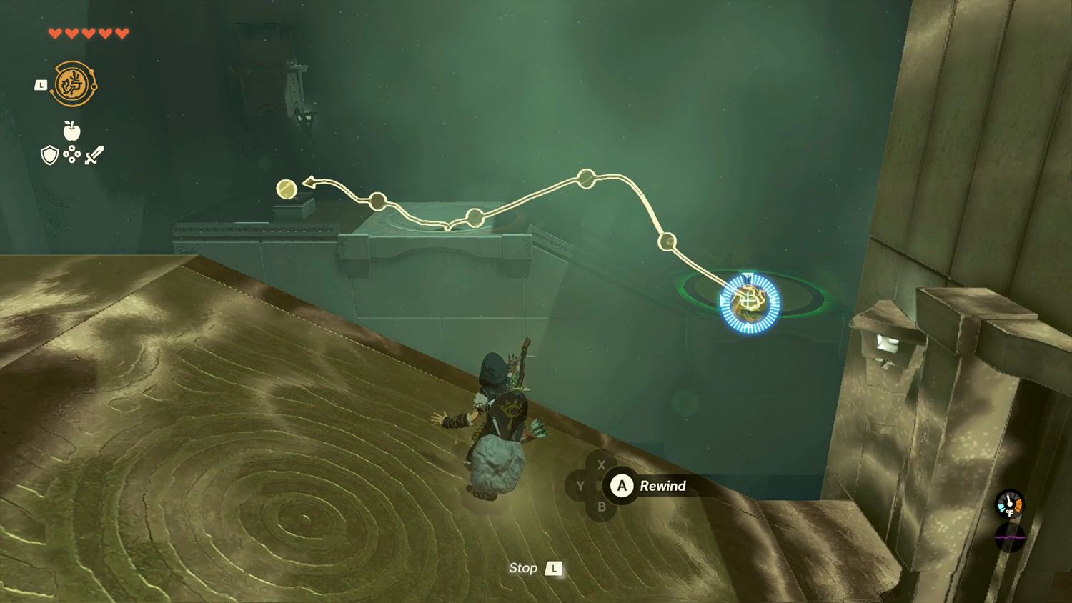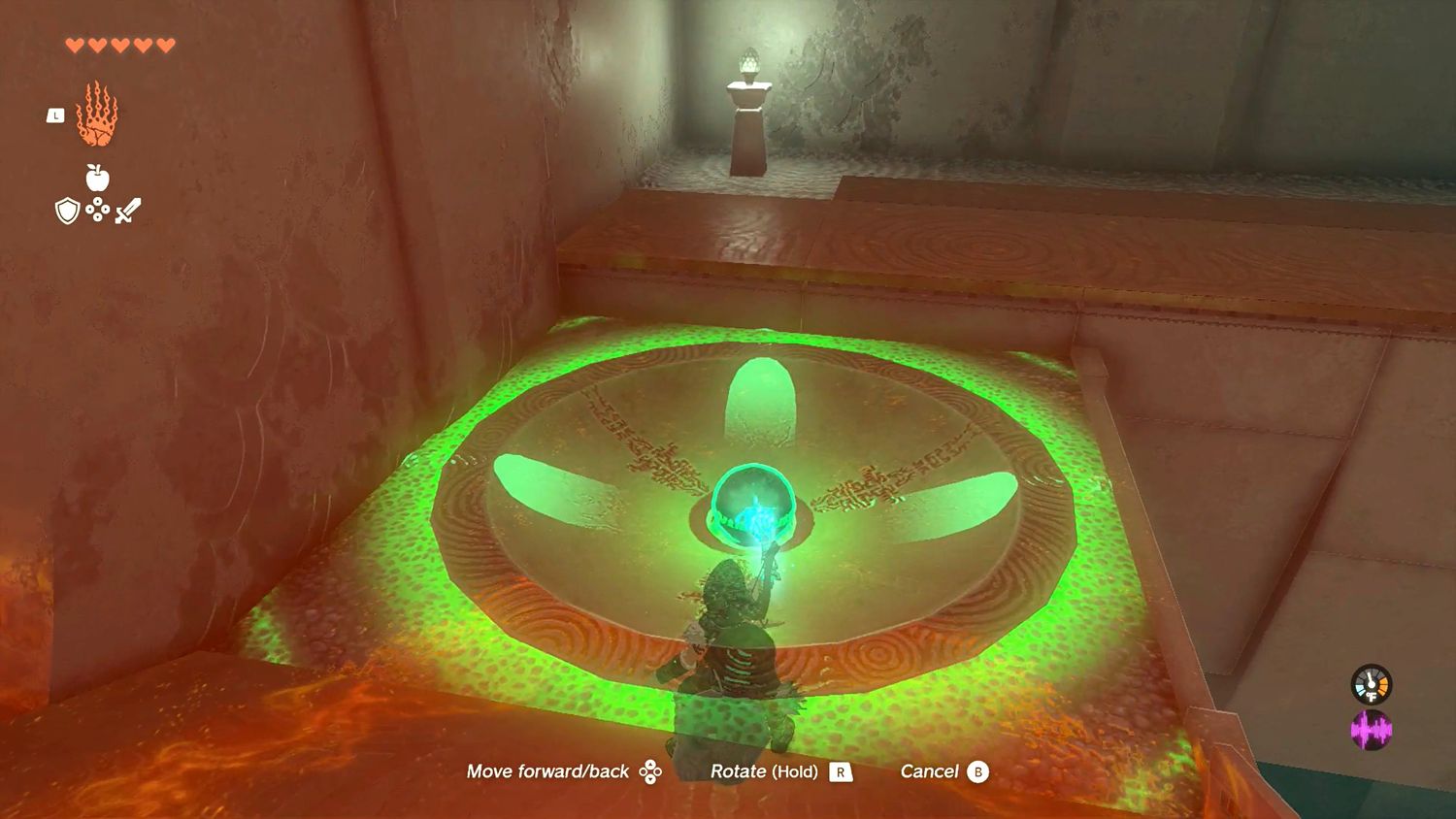 En el interior, los jugadores se encontrarán en una cámara más grande. Las puertas de adelante están cerradas, por lo que los jugadores deben dirigirse al lado derecho de la habitación, donde encontrarán dos hoyos en el piso y una pelota que pueden mover con Ultrahand.
