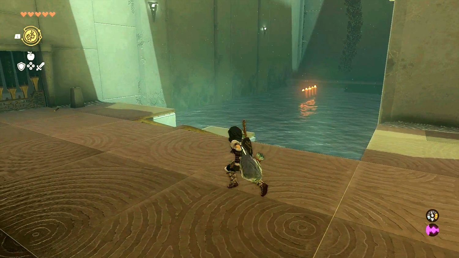 Link se encontrará en un área más grande, con un charco de agua a la derecha. A medida que los jugadores se acerquen al agua, deberían ver una balsa de madera flotando fuera del alcance de Link nuevamente hacia una fila de braseros de piedra en el agua.