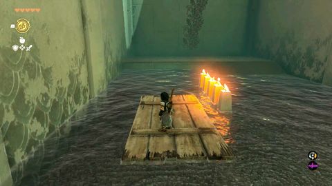 Agarra la antorcha apagada en el suelo junto a la puerta cerrada, lanza Recall en la balsa y súbete. Cuando la balsa pase por los braseros en el agua, úsalos para encender la antorcha apagada en la mano de Link.