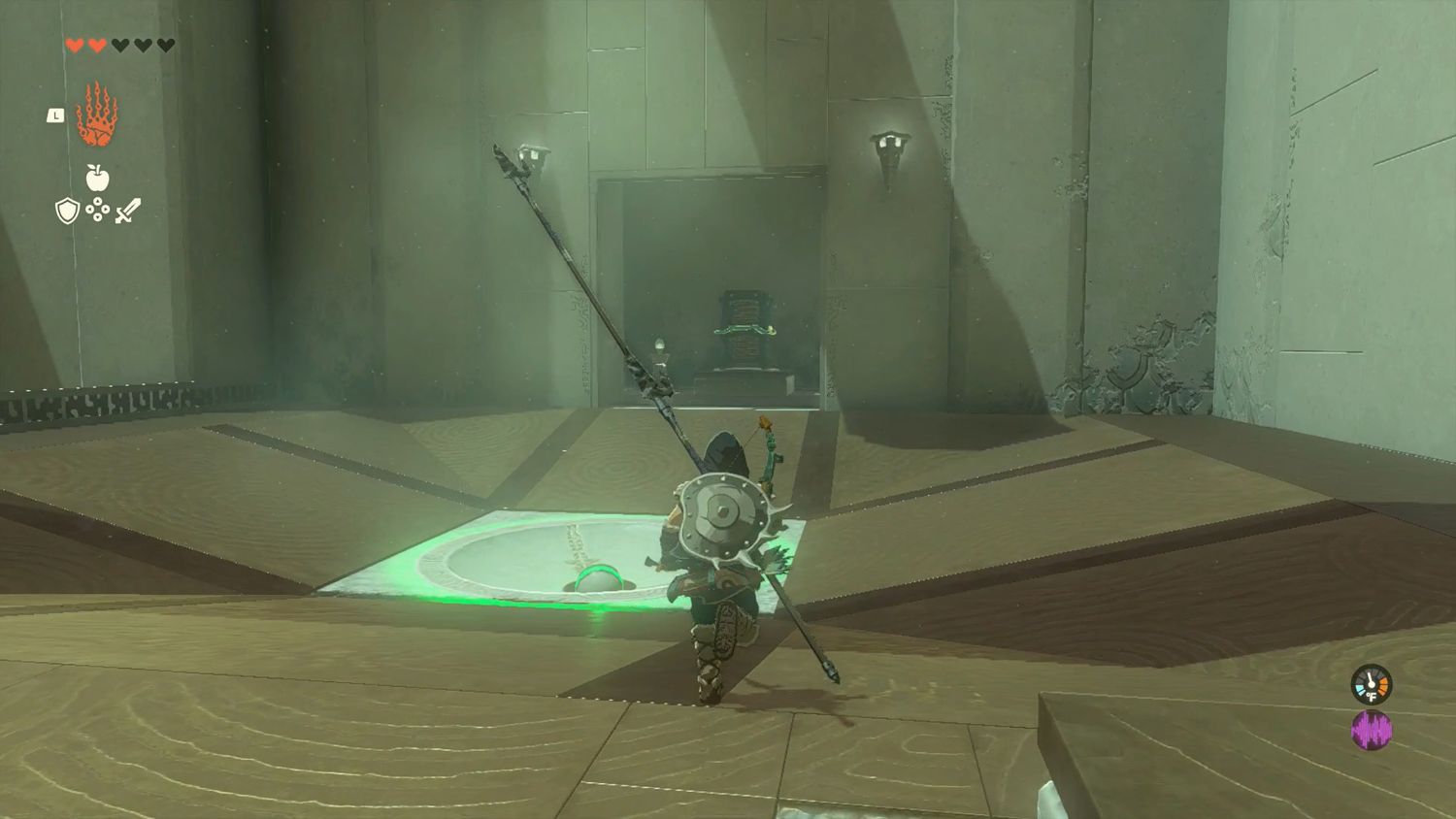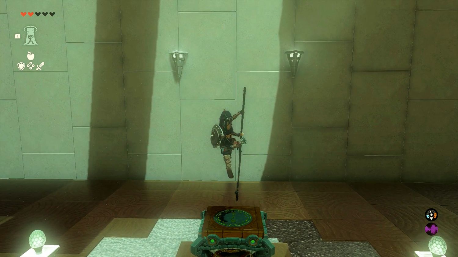 Tome el resorte triple y colóquelo contra la pared a la izquierda de la puerta. Link puede subir y activar el resorte, lanzándose hasta el final del Santuario Morok.