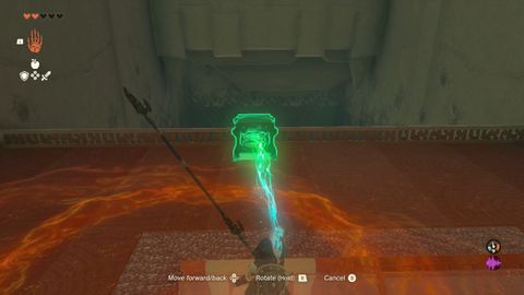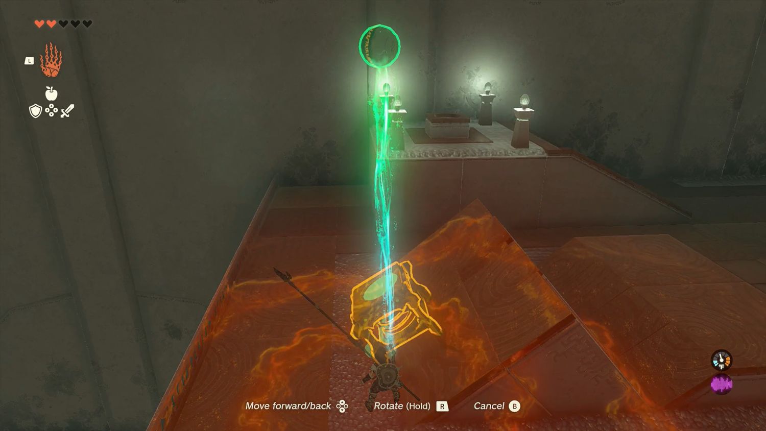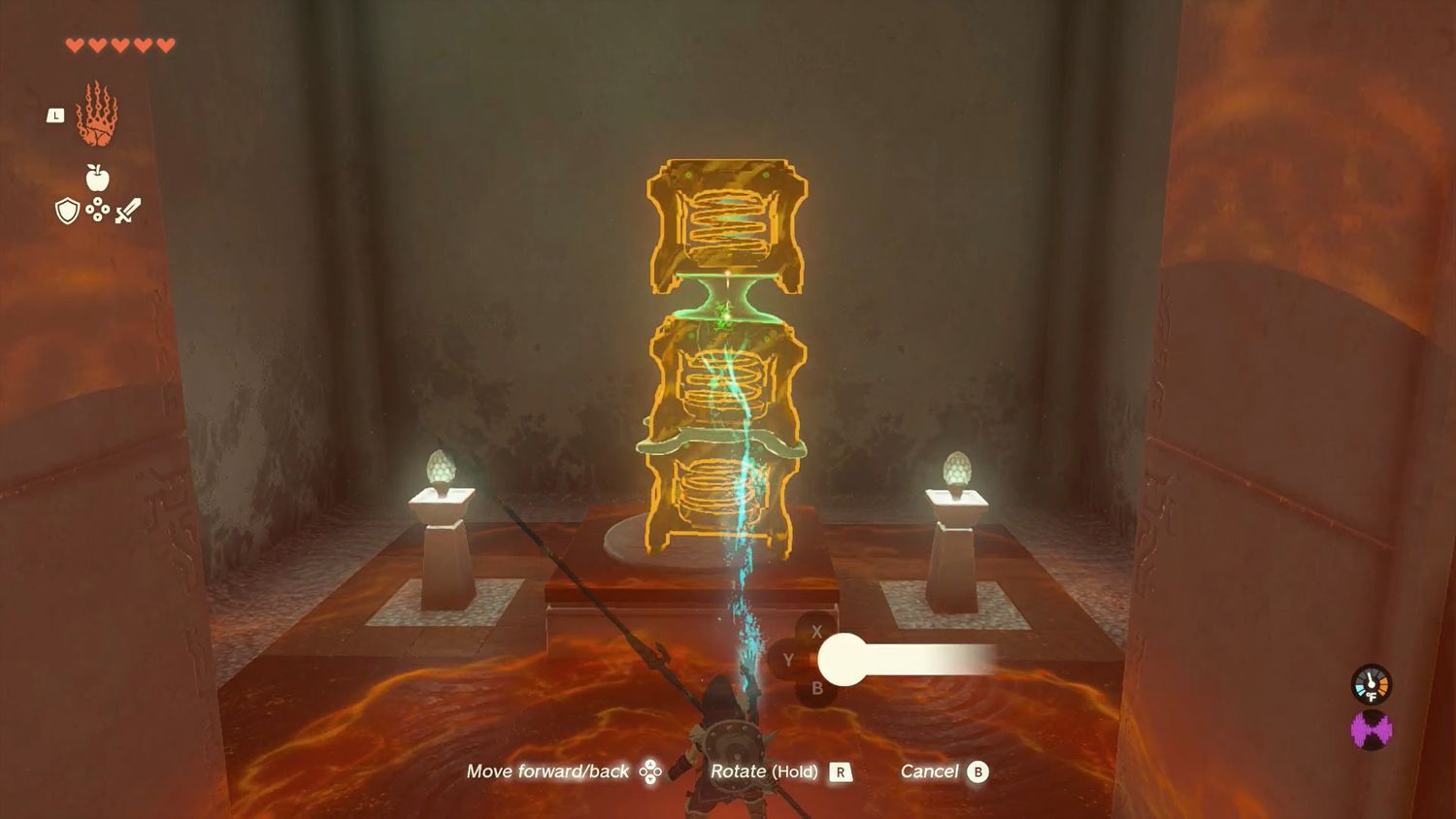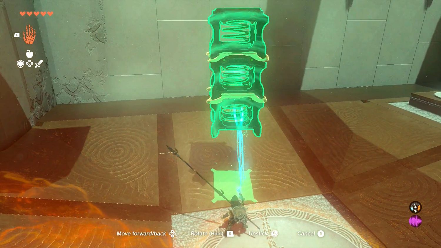 En el otro lado de la habitación, los jugadores encontrarán una bola de piedra, otro resorte que se puede mover con Ultrahand y un bloque diagonal. Use Ultrahand para colocar el resorte en el lado del bloque diagonal como se muestra arriba. Link tendrá que agarrar y dejar caer la bola de piedra antes de golpear el resorte en el momento adecuado para activarla. Esto lanzará la pelota hacia el otro lado de la habitación. Sin embargo, el momento puede ser complicado de lograr.