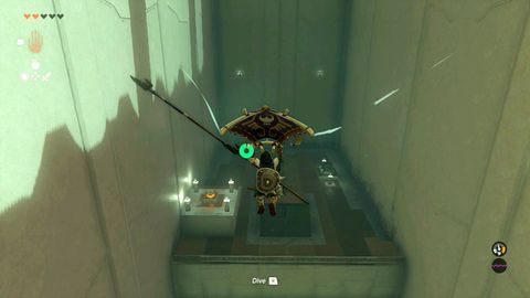 La pelota se encuentra en la otra parte de este piso, al otro lado de un pozo sin fondo. Para cruzar, toma el manantial cercano con Ultrahand y colócalo en el borde del pozo. Usa el resorte para lanzar a Link por los aires y deslizarte hacia el otro lado de la habitación.