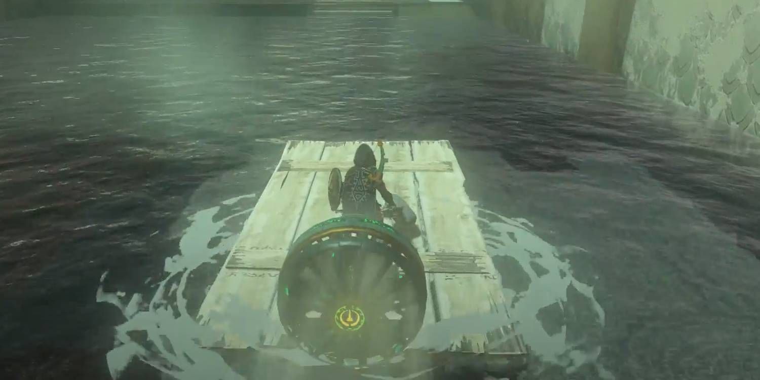 Una vez que los jugadores crean un flujo de aire, deben saltar al aire y sacar su parapente para que el viento los lleve hasta la cornisa. Desde aquí, encontrarán un gran masa de agua que debe cruzarse con otro abanico y una tarima de madera tumbado cerca. Desde aquí, los jugadores deben use Ultrahand para colocar la plataforma en el aguaentonces conecte el ventilador a la plataforma para que el flujo de aire los empuje a través del agua.