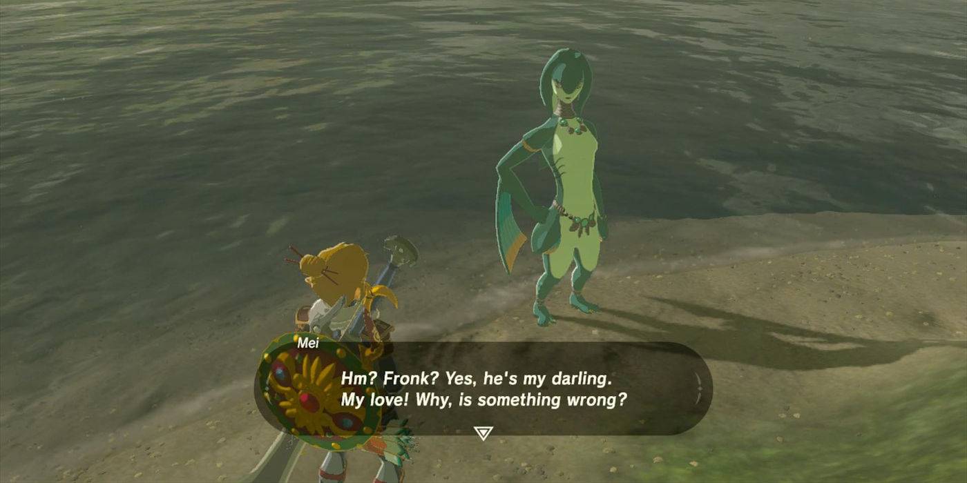 Después de que el agua sea pura y fluya hacia el Dominio de Zora nuevamente, Link puede encontrar a Zora llamada Fronk en el camino principal hacia la ciudad.. Se ve molesto y sigue diciendo el nombre “mei.” Cuando habla con él, le cuenta a Link sobre su esposa, Mei, a quien le preocupa que haya ido a pescar a algún lugar peligroso. Como tal, le pide a Link que la busque.