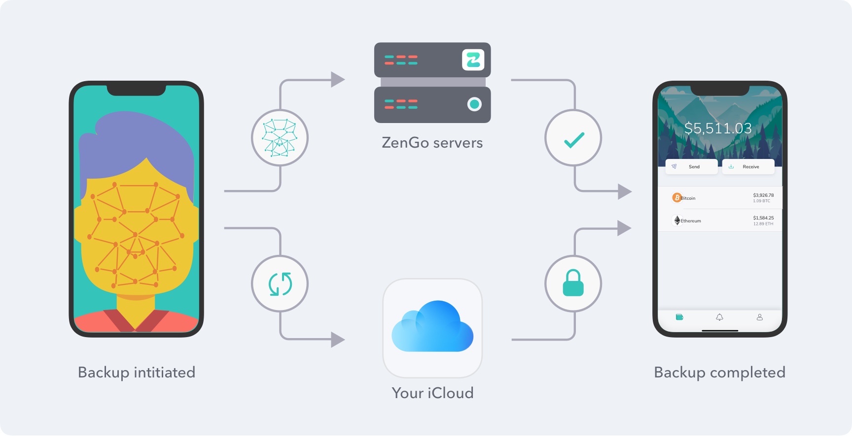 Las tiendas ZenGo no pueden acceder directamente a la segunda parte, ya que está cifrada mediante un código de descifrado que se almacena en su cuenta de iCloud. Pero acceder a su iCloud no es suficiente: si desea recuperar sus billeteras, necesita demostrar su identidad.