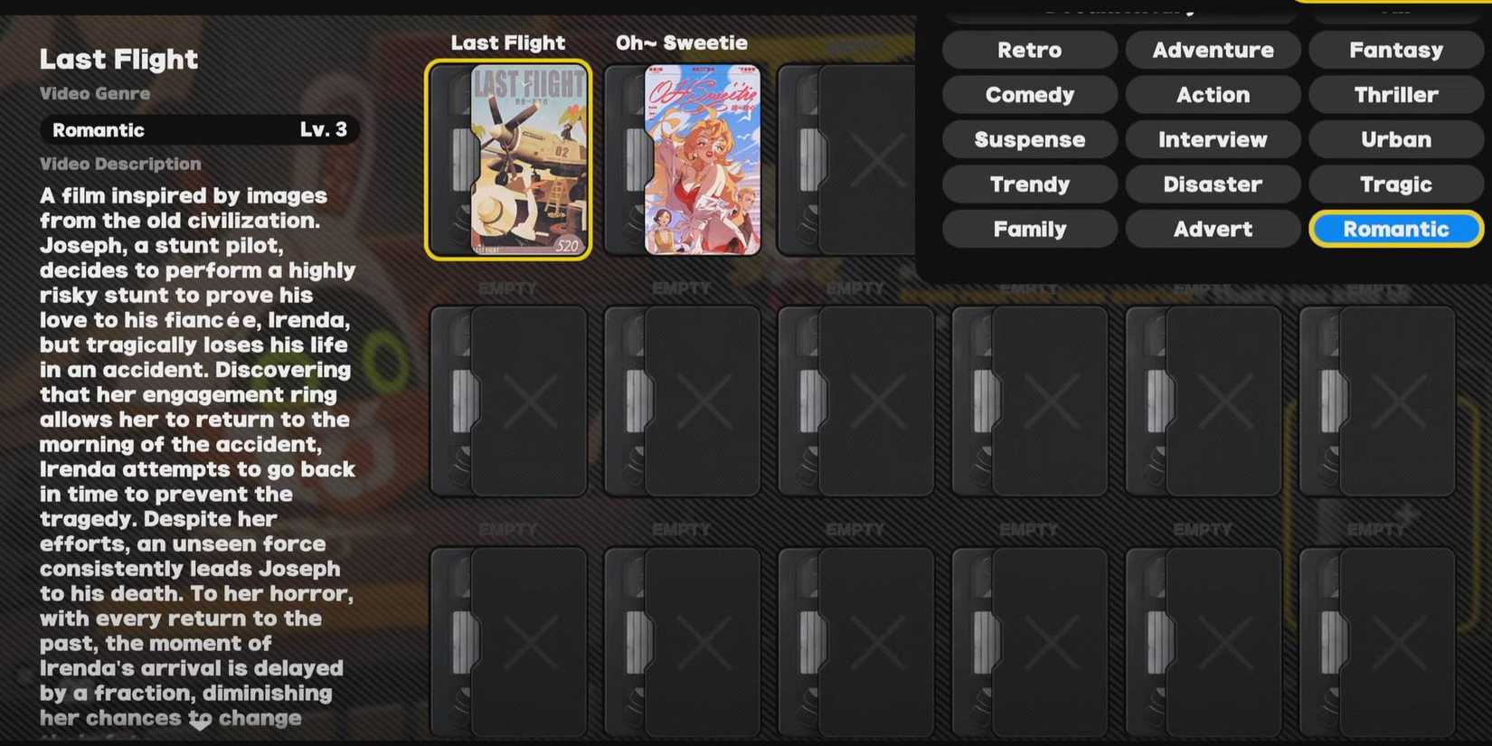 La tienda de videos de reproducción aleatoria es un excelente lugar para ganar Dennies a medida que exhibes ciertas cintas cada día. Nombras a diferentes promotores para que administren la tienda mientras cumples con pedidos como el de Love-Crazed Girl para ganar artículos valiosos con un mínimo esfuerzo. Sin embargo, de manera similar al pedido del NPC Nostalgic Girl, solo recibes pistas vagas sobre qué cinta de video está buscando el cliente.