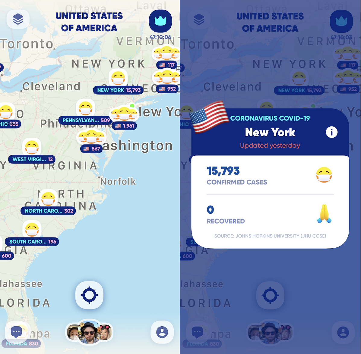 Sin embargo, lo que realmente podría marcar la diferencia para convencer a las personas de que hagan su parte para combatir esta pandemia mundial es la lente de coronavirus de Zenly para su mapa. Le permite mirar alrededor del mundo y ver la cantidad de casos confirmados y recuperaciones en cada país o estado. Zenly actualiza los datos tres veces al día en función de El Centro John Hopkins de Ciencia e Ingeniería de Sistemas. El mapa también superpone información de la OMS, BNO News de los Países Bajos, DXY de China y este GitHub de crowdsourcing.