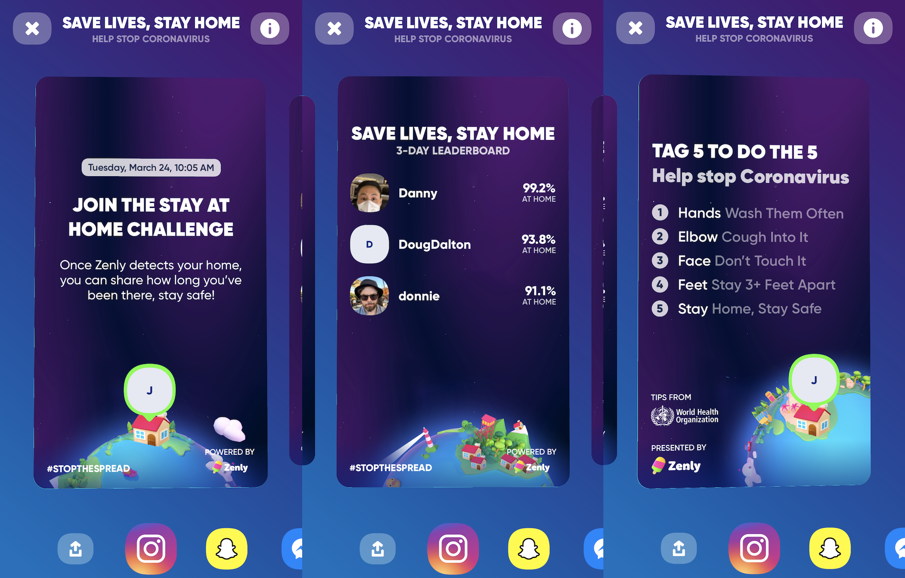 Adquisición de aplicaciones para compartir ubicación de Snapchat Zenly ha refugiado en el lugar durante el brote de COVID-19. Hoy, la aplicación lanzó su desafío Stay At Home que muestra una tabla de clasificación en la que los amigos han pasado la mayor parte de los últimos tres días en sus hogares. Los usuarios pueden ver quién es el mejor distanciador social y compartir calcomanías del tablero y consejos de prevención de coronavirus para Snapchat, Instagram y otras aplicaciones.