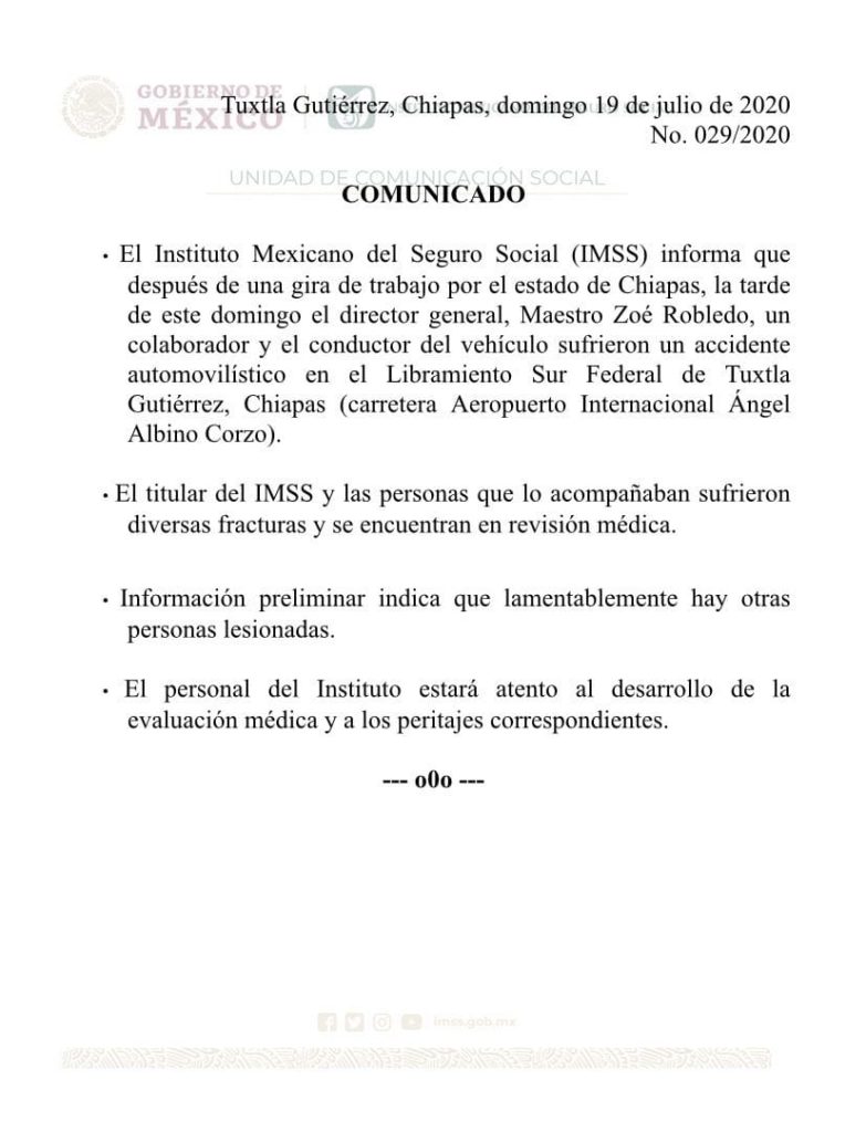 El director general del IMSS, Zoé Robledo, sufrió un accidente automovilístico en el Libramiento Sur Federal de Tuxtla Gutiérrez, Chiapas (carretera Aeropuerto Internacional Ángel Albino Corzo) después de una gira de trabajo por dicha entidad, informó el Instituto Mexicano del Seguro Social la noche de este domingo.