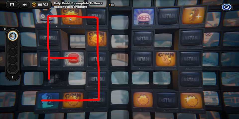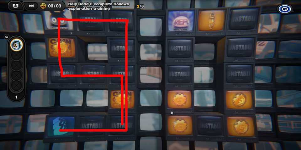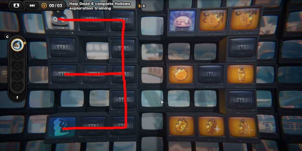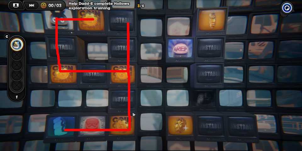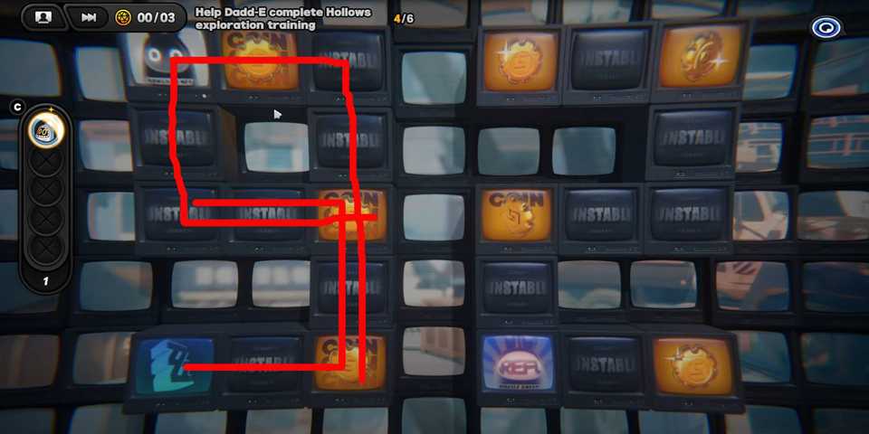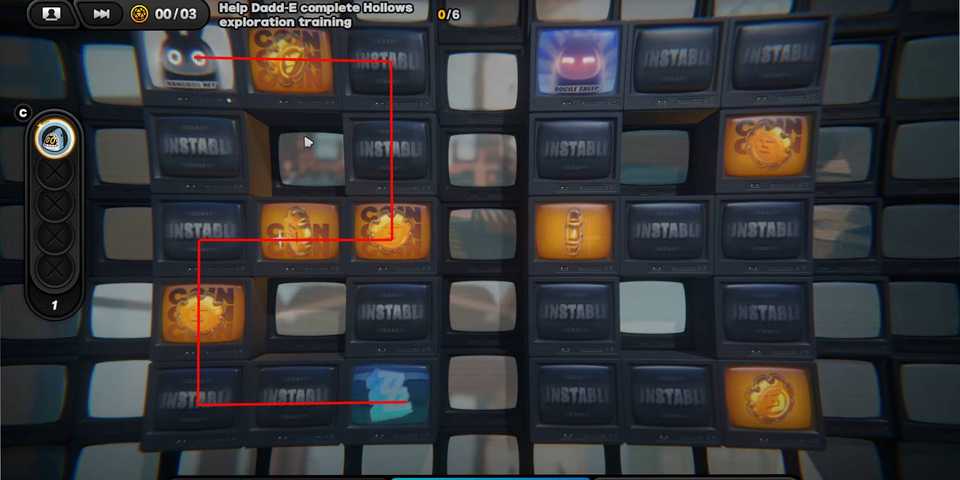 En cada cuadrícula, usted empieza en la esquina superior izquierda y necesito Dibuja un camino que llegue a todos los monitores con pantallas doradas tanto de tu lado como del de Dadd-E.Dado que tu conjunto de monitores y el de Dadd-E no son idénticos, tendrás que retroceder en los espacios para llegar a todas las pantallas necesarias. Solo tienes 30 movimientos en cada rompecabezas.lo que limita significativamente tus opciones mientras intentas completar tanto tu camino como el reflejado de Dadd-E.