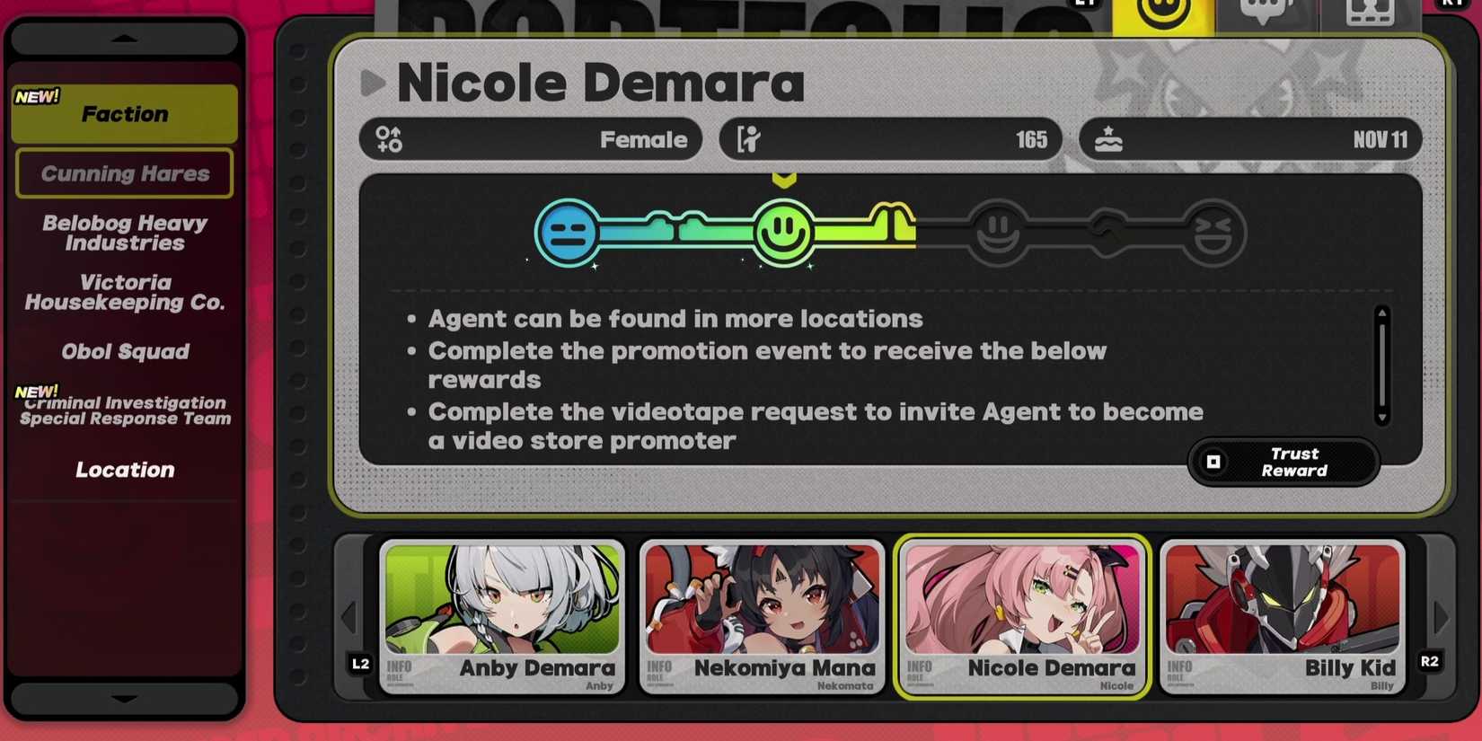 Al igual que con otros agentes en Zona cero sin zenLos eventos de confianza con Nicole pueden brindar recompensas útiles adicionales, por lo que es esencial tener la lista de respuestas correctas. A diferencia de los lugares de reunión, Nicole puede aparecer en momentos aparentemente aleatorios en Sixth Street con eventos de diálogo espontáneos. Si bien la mayoría de las opciones pueden aumentar su nivel de confianza, elegir la respuesta incorrecta puede provocar una disminución, lo que no es útil para los jugadores que intentan maximizarlo rápidamente.