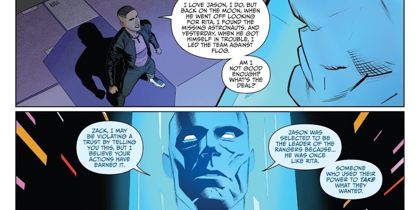 El debate termina cuando Zordon explica la impactante razón por la que eligió a Jason para ser el líder de los Power Rangers en Vamos, Power Rangers #4 de Ryan Parrott, Dan Mora, Raúl Angulo y Ed Dukeshire. Irónicamente, posiblemente incluso respondiendo directamente a los debates en curso sobre el potencial de liderazgo de Zack, es el Black Ranger quien primero le plantea la pregunta a Zordon.