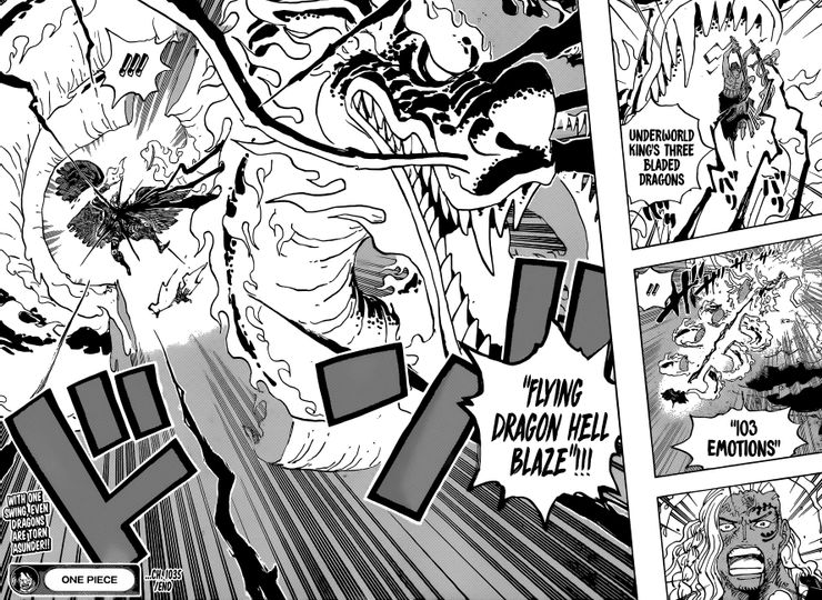 King desató su “Dragón Llameante Guardián Imperial”, un estallido de llamas en forma de dragón. Zoro respondió con un ataque final propio que une todas las armas de su arsenal: “Estilo del Rey Tres Espadas de Underworld: 130 Emociones, Flying Dragon Hell Blaze”. “Rey del inframundo” es el significado del nombre de la espada Enma, una deidad guardiana legendaria del inframundo en el budismo y la mitología japonesa. El Estilo de las Tres Espadas es el que Zoro desarrolló personalmente, para continuar el sueño de su amigo de la infancia Kuina de convertirse en el espadachín más fuerte del mundo. En ese estilo, el “Flying Dragon Blaze” (Hiryū: Kaen) es un ataque que Zoro realizó anteriormente usando solo una espada, y fue lo suficientemente poderoso como para preocupar incluso a Kaidou. Ahora, lo ha usado con el Estilo de las Tres Espadas y lo ha imbuido con el Haki del Conquistador, lo que resultó en un golpe tan poderoso que cortó a través del dragón de fuego de King y luego a través del propio King, cortando su espada y una de sus alas.